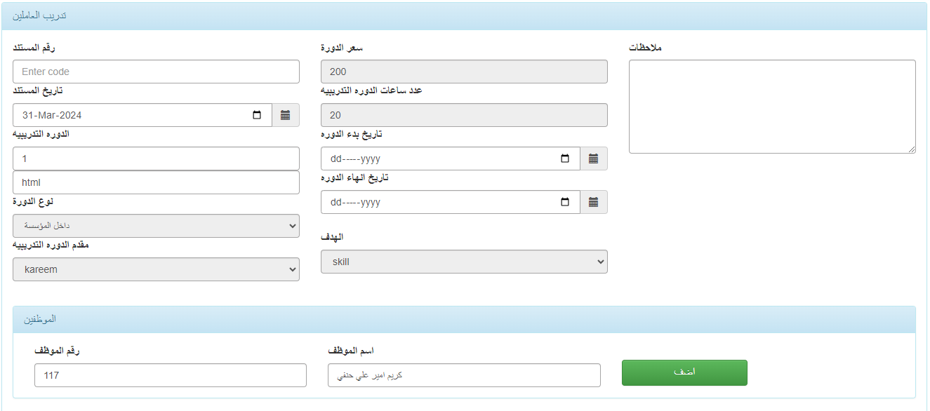 تقوم بكتابة كود الكوظف المراد اضافته للدورة التدريبية.
