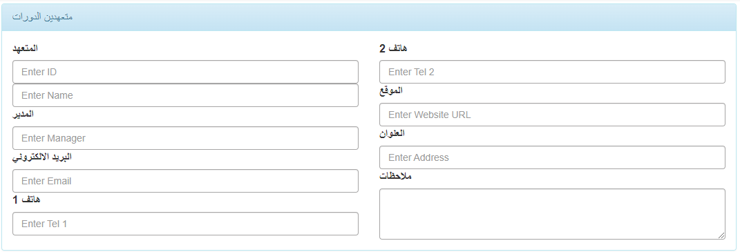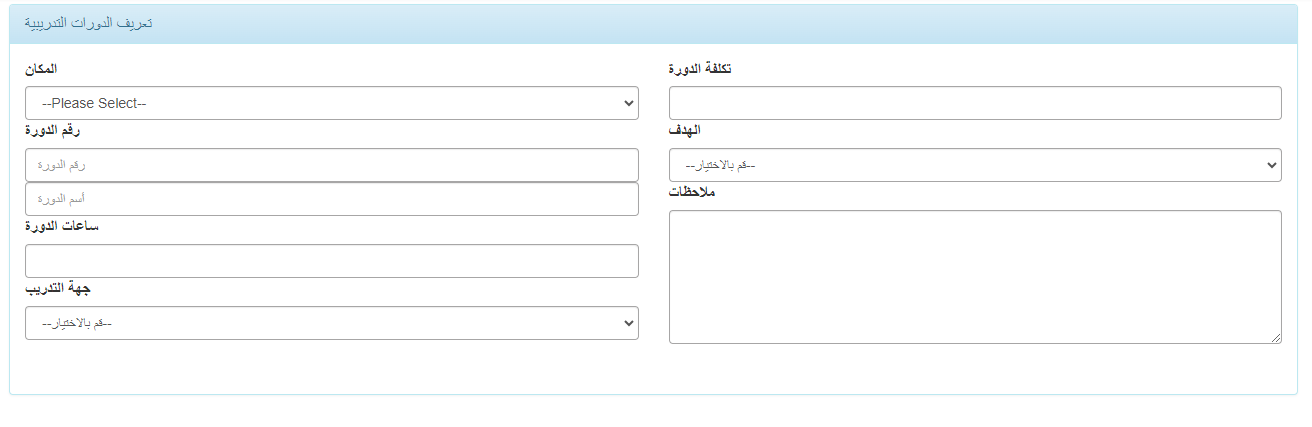 نقوم بتحديد مكان التدريب المراد تعريفه ونحدد رقم للدورة الخاصة به وساعات التدريب وجهة التدريب وايضا تكلفة الدورة التدريبية وتحديد الهدف من التدريب وكتابة اى ملاحظات نريد تدوينها على اى دورة تدريبية.