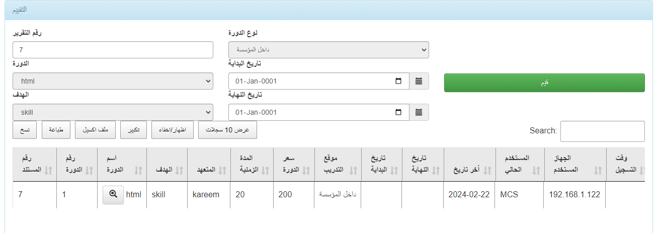 نقوم بعمل التقييم الخاص بكل دورة تدريبية ونقوم بتقييم كل موظف داخل الدورة التدريبية ويمكننا معرفة عدد الدورات التي لما يتم تقيمها خلال فترة معينة.