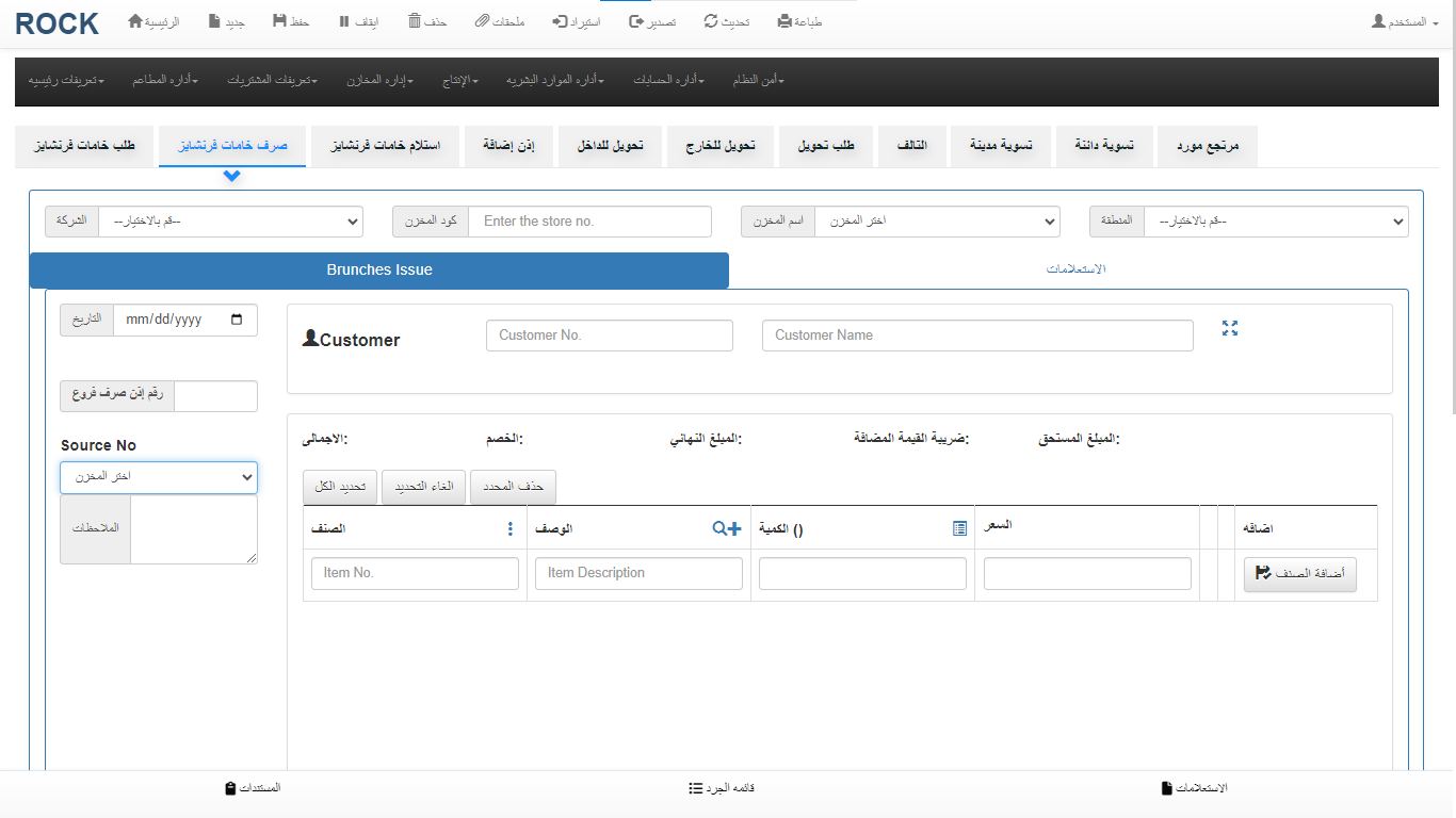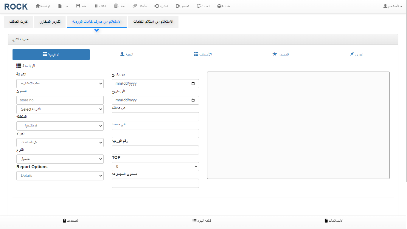 من خلال ادخال البيانات الأساسية (شركة، مخزن، منطقة، اجراء، النوع، تاريخ، رقم المستند، رقم الوردية).
